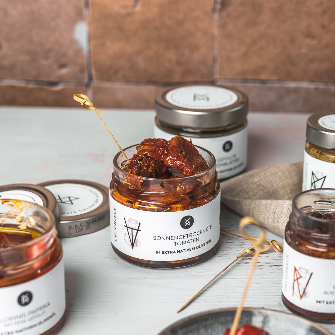 Köstlichkeiten - „Mezedes“ - verschiedenster Art sind feine Leckerbissen. Sie sind das Herz der griechischen Küche und das Vorspiel jedes griechischen Dinners. Für unsere eingelegten Köstlichkeiten verwenden wir ausschließlich beste Zutaten und unser eigenes hochwertiges Olivenöl extra nativ. Sie geben den Gästen einen kleinen Vorgeschmack auf das was sie erwartet und eine leichte Vorfreude auf die folgenden Genüsse.