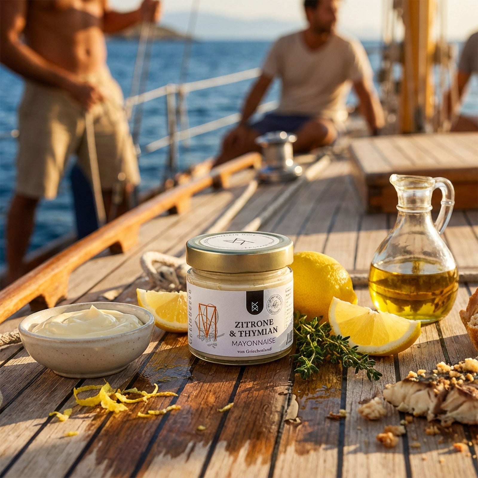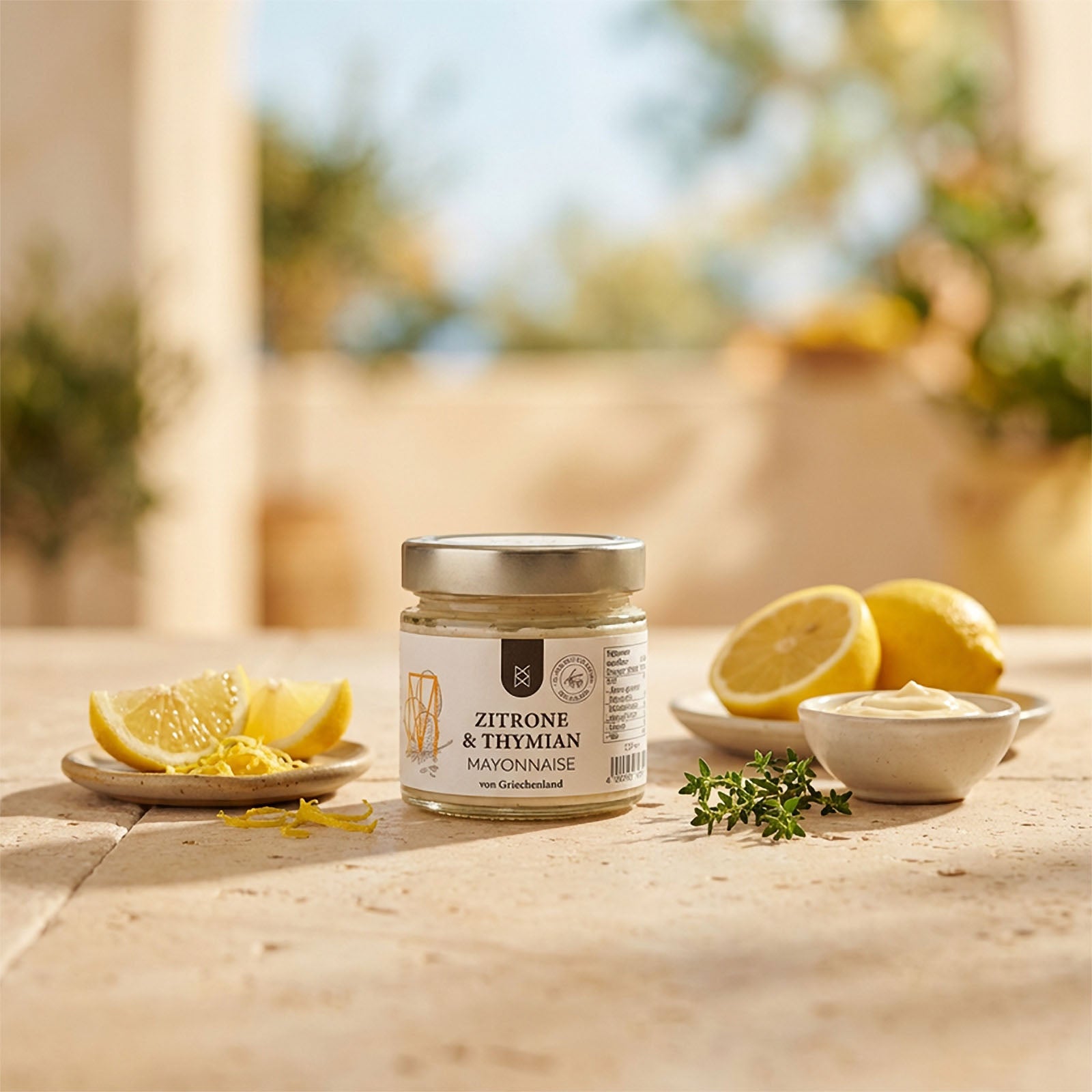 Feine Zitronenfrische, mediterraner Thymian und extra natives Olivenöl machen diese Mayo zum perfekten Begleiter für Fisch, Meeresfrüchte, Gemüse und Bowls – für Gerichte, die nach Urlaub schmecken, ohne dass du lange in der Küche stehst.