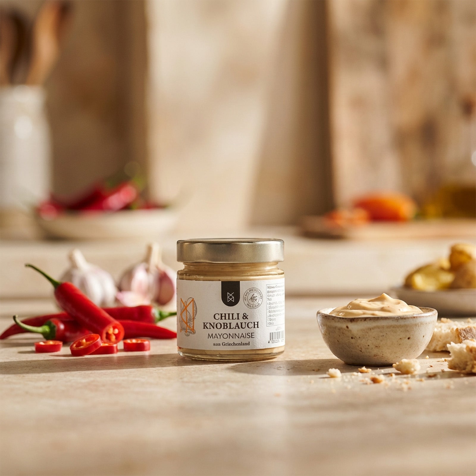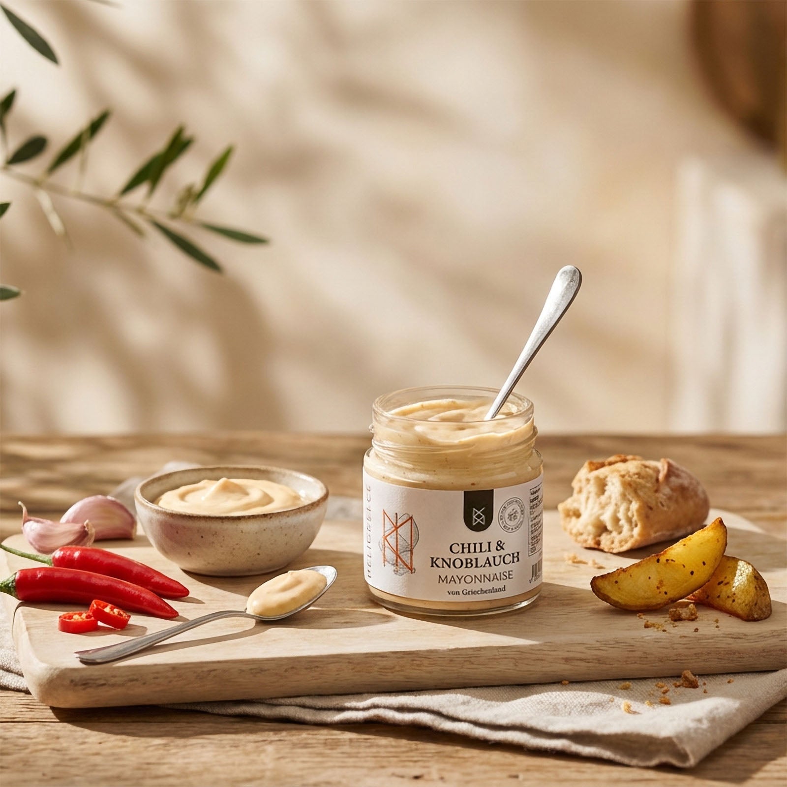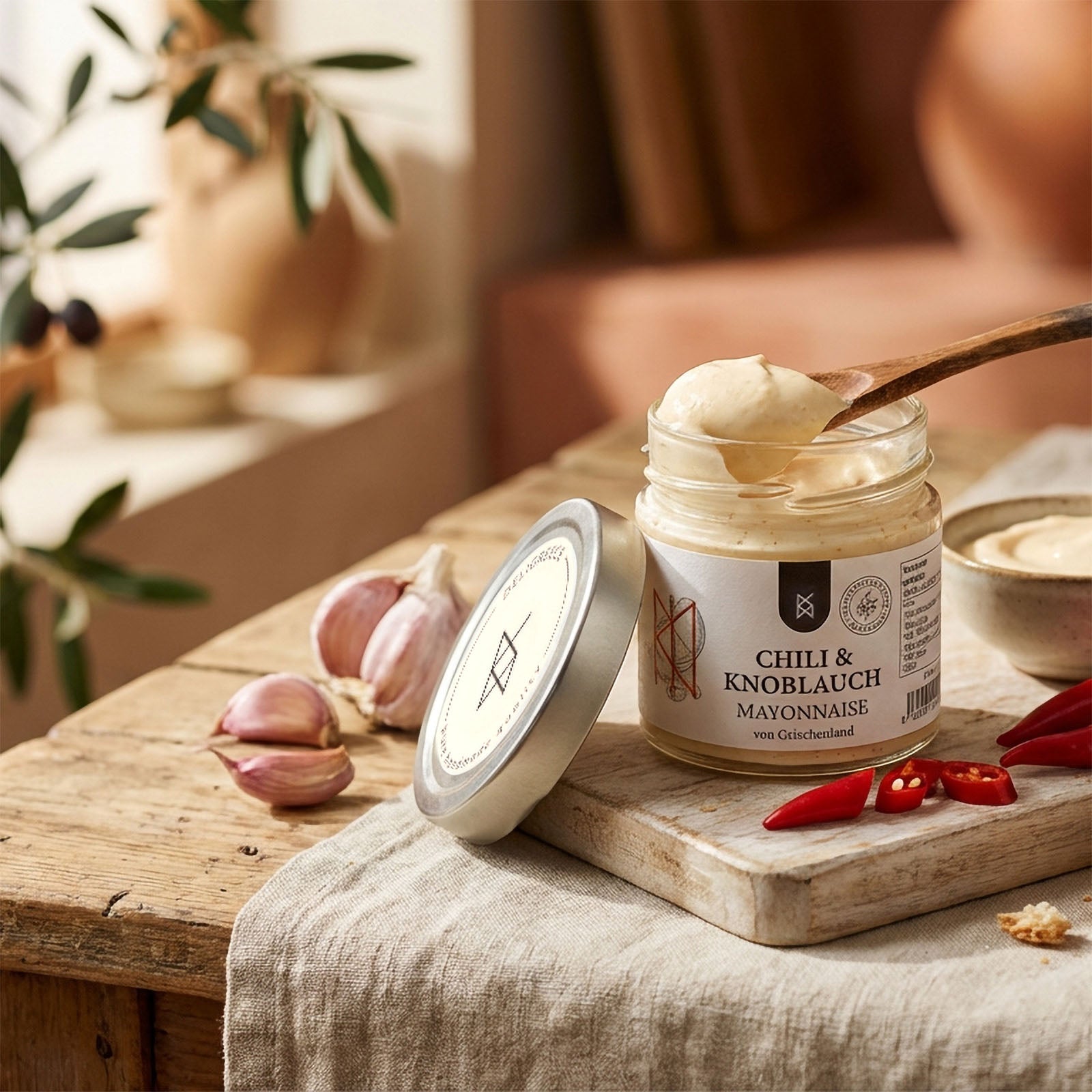 • Chili & Knoblauch Mayonnaise – cremig, pikant, mit deutlicher Knoblauch-Note